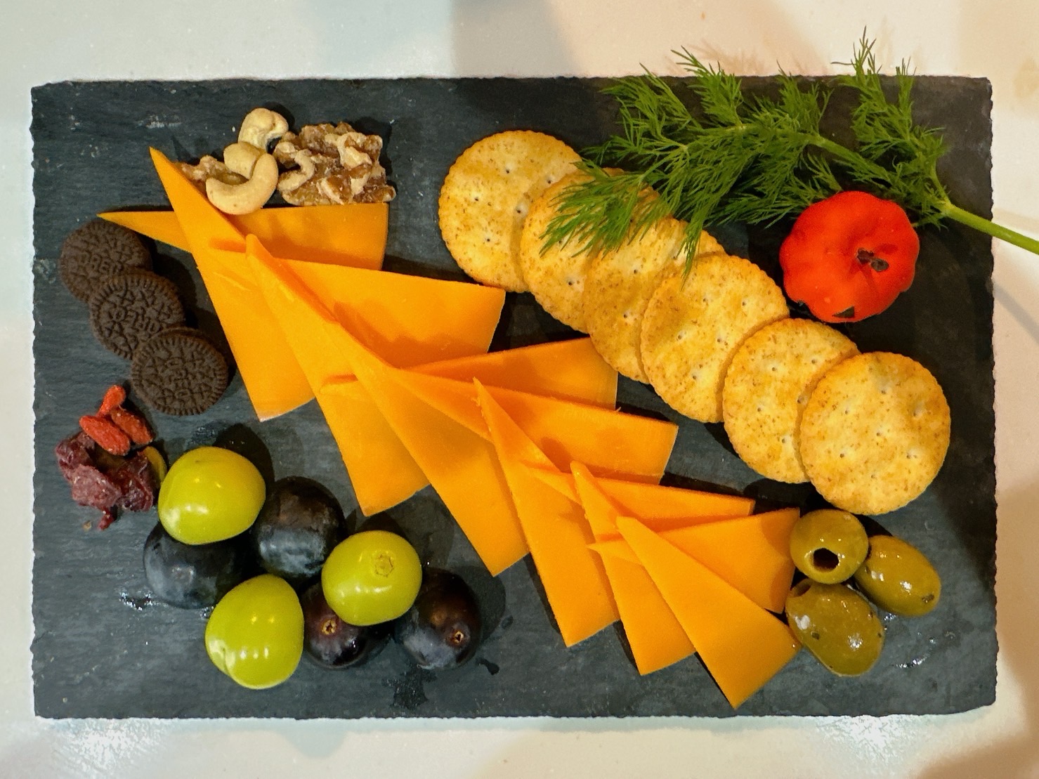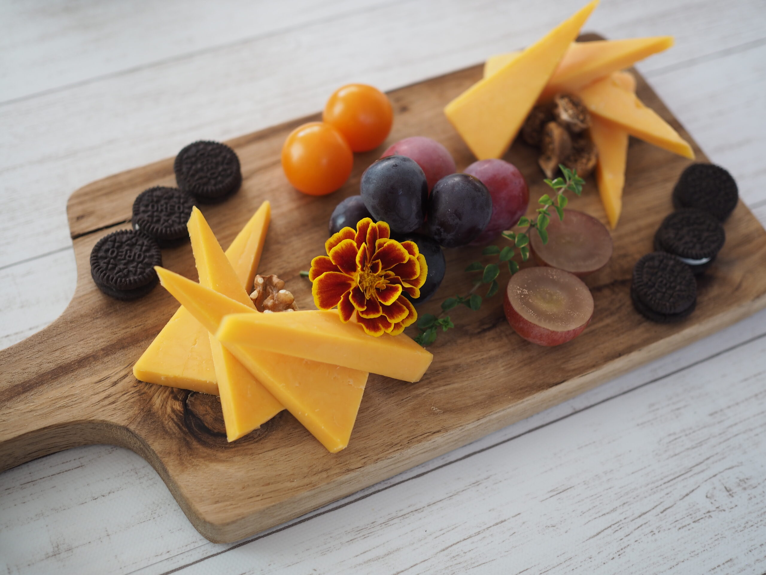 普段はあまり気にしないチーズの色かもしれませんが、きれいなオレンジ色のチーズもスーパーでもいくつか探すことができます。これを使って秋らしい盛り付けを楽しんでもらうことにしました。